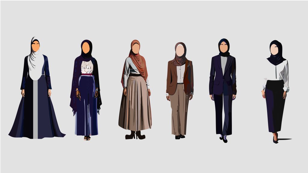 - Blazer bersama skirt atau seluar: Blazer yang elegan digandingkan dengan skirt panjang atau seluar yang kemas. Pilihan warna yang sesuai termasuk hitam, biru gelap, atau kelabu.
