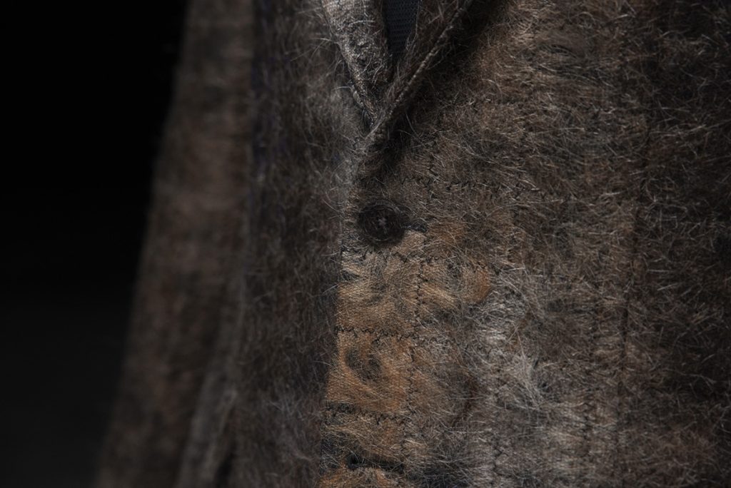 Setiap bulu ini juga digabungkan dalam lapisan fabrik kapas hitam POLITIX dan tulle hitam halus, membentuk apa yang digelar Pamela sebagai mo-hair sandwich yang mana ia langkah inovatif yang menggabungkan tekstur dan warna semula jadi bulu misai dalam rekaan formal.