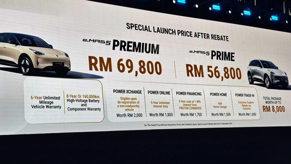Untuk pengetahuan anda, Proton e.MAS 5 hadir dengan jaminan enam tahun tanpa had perbatuan dan jaminan bateri serta komponen selama lapan tahun atau 160,000 km, mengikut mana-mana yang terdahulu. Bagi pembelian sebelum akhir tahun 2025, pelanggan akan menerima rebat RM3,000 menjadikan harga promosi RM56,800 untuk Prime dan RM69,800 untuk Premium.