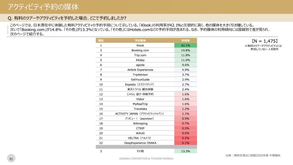 Laporan Airport Exit Survey 2025: Interim Report terbitan Biro Konvensyen & Pelancongan Osaka (OCTB) yang dikeluarkan pada Oktober 2025 mendedahkan kedudukan kukuh Klook sebagai platform utama pilihan pelancong antarabangsa untuk tempahan lawatan berbayar dan aktiviti ketika berada di Jepun.