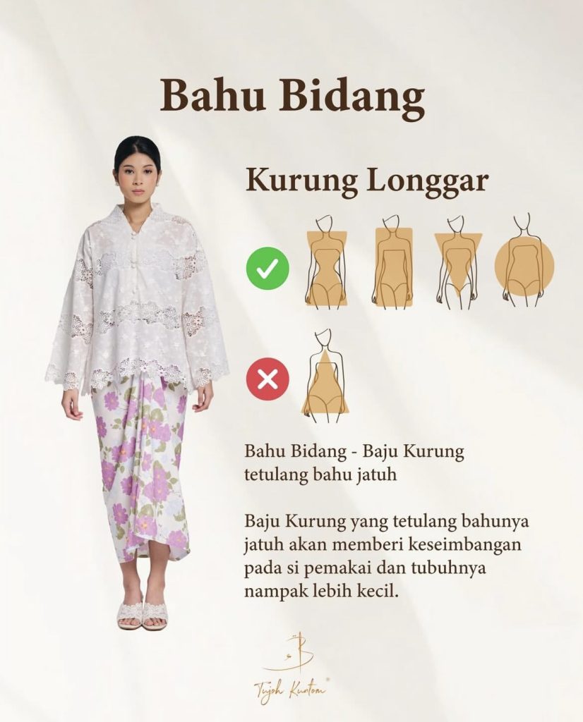 Bagi yang bertubuh kurus dan tinggi, potongan labuh seperti kebaya labuh atau kurung moden amat sesuai digayakan. Potongan ini membantu memberi ilusi tubuh yang lebih berisi dan seimbang.