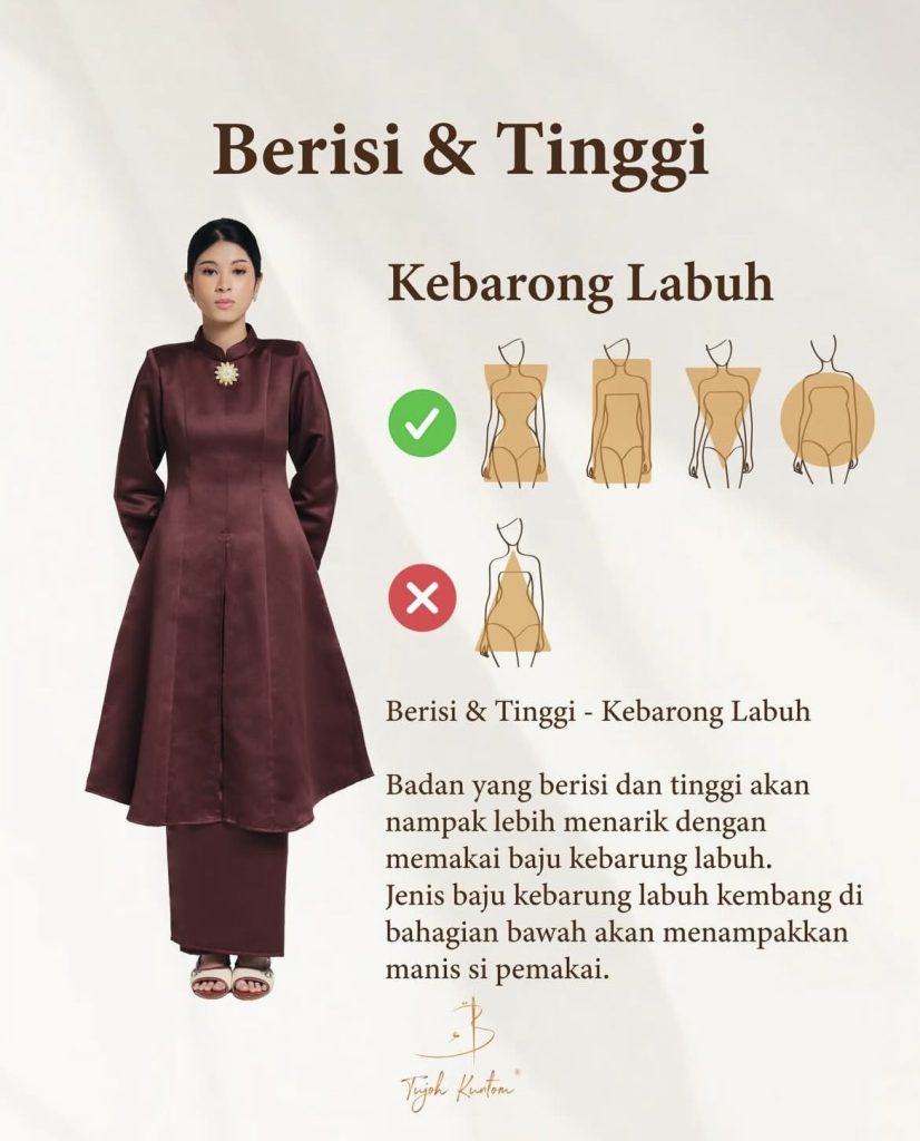 Bagi yang bertubuh sedikit berisi dan tinggi, kebarung atau kurung moden berpotongan labuh yang sedikit kembang di bahagian bawah adalah pilihan tepat. Potongan ini membantu melembutkan siluet dan menyamarkan bahagian pinggul serta paha, sekali gus memberi penampilan yang lebih manis dan elegan.