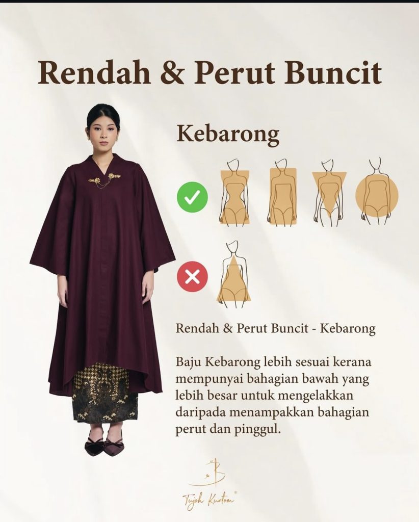 Bagi yang bertubuh rendah dan mempunyai bahagian perut yang sedikit menonjol pula, kebarung atau potongan A-line adalah pilihan sesuai. Bahagian bawah yang lebih lebar membantu menyamarkan bentuk perut dan pinggul, selain memberikan keselesaan sepanjang hari raya.